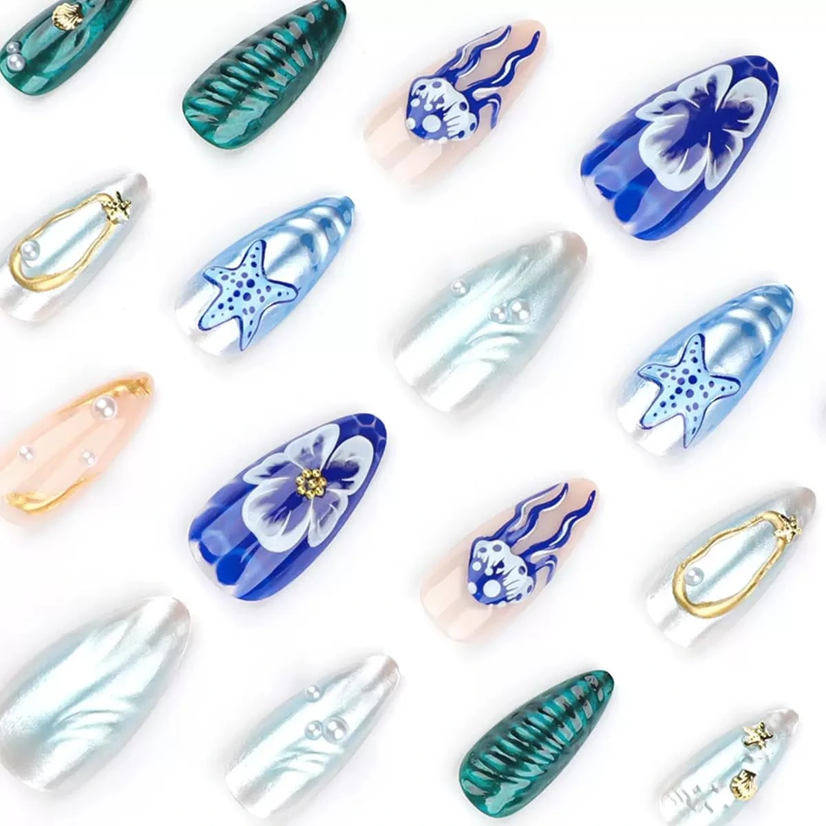 Medium almond nails with 3D ocean design in glossy blue. 24-piece full cover stick-on nails, reusable, stylish, and salon-quality at home.