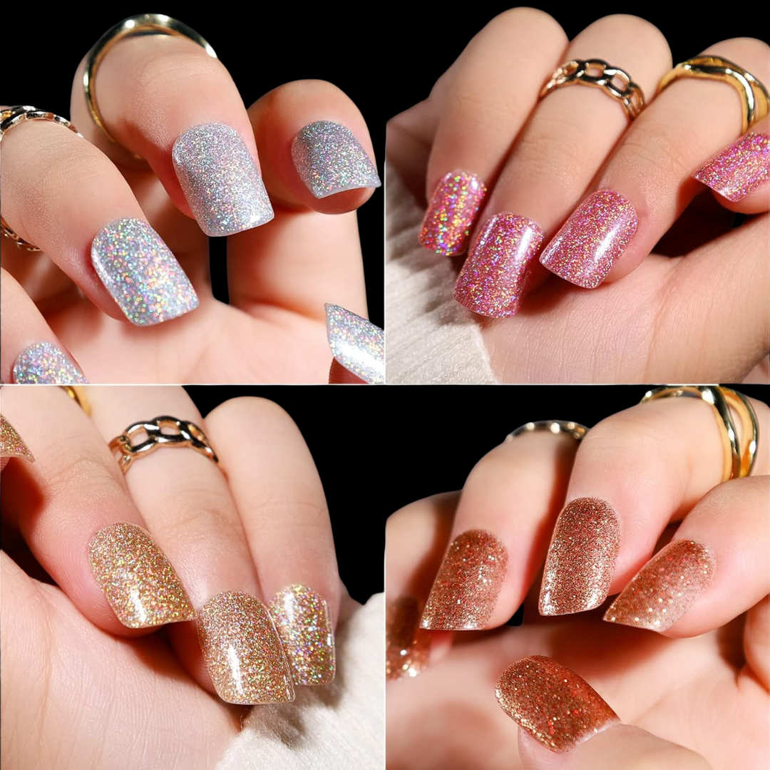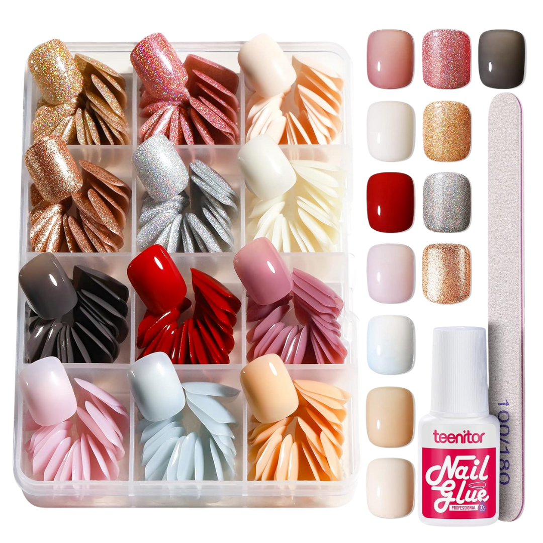 Whether you struggle with fragile natural nails or don’t have time for appointments, the best short press-on nails give you a flawless, long-lasting manicure that looks beautifully natural and fits your everydayation with the perfect complete set from the “Best Short Press On Nails” line, for busy working women looking for temporary, beautiful, natural nails without booking salon appointments for hours. The set includes 288 short, square, glossy, and glittery nails, plus brush-on nail glue and a 100/180 nail file, and contains all necessary components for a quick, easy, and lasting home manicure.