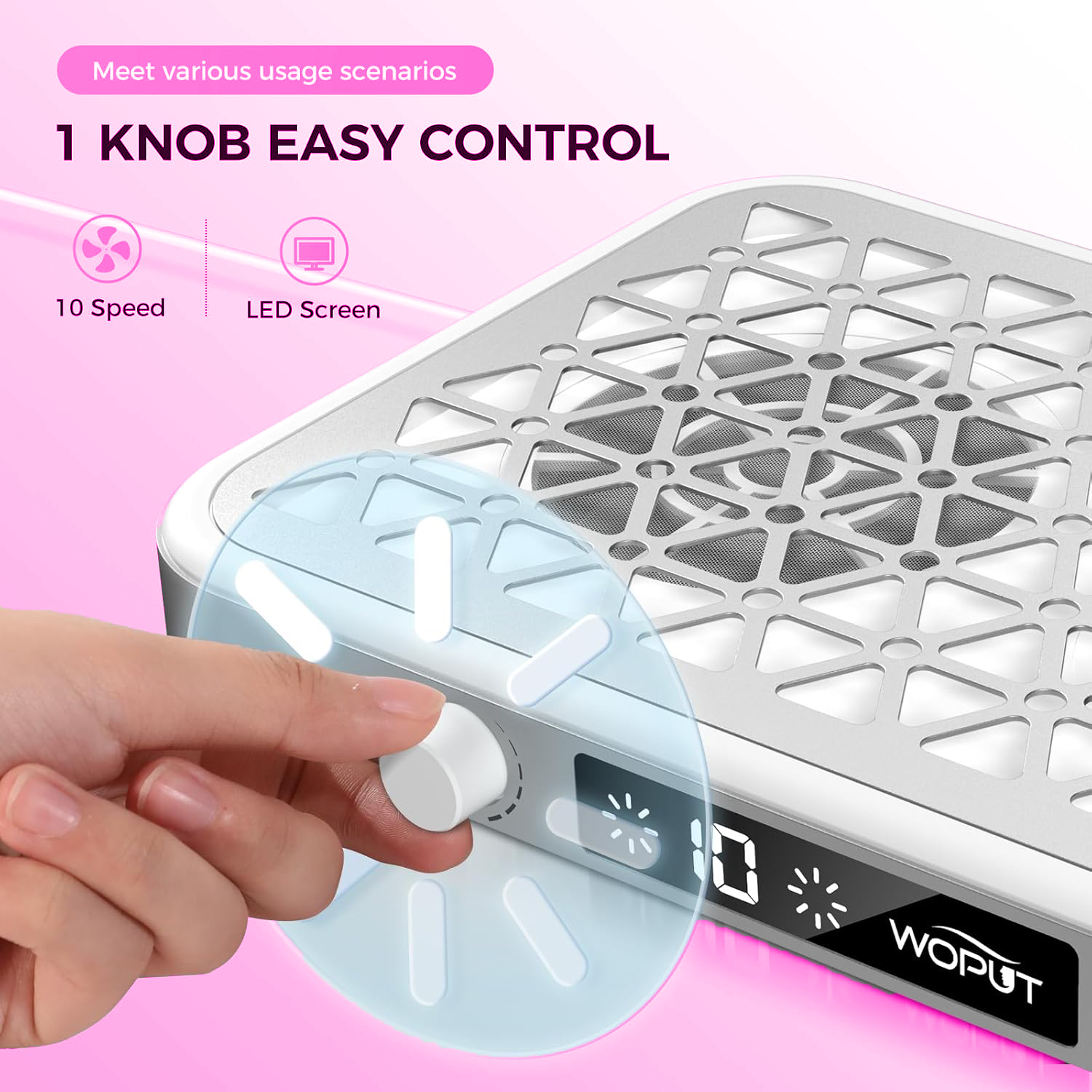 Dust and debris from filing, buffing, or acrylic work are easily drawn in by this portable, powerful nail dust collector, leaving your workspace tidy and the air fresh.