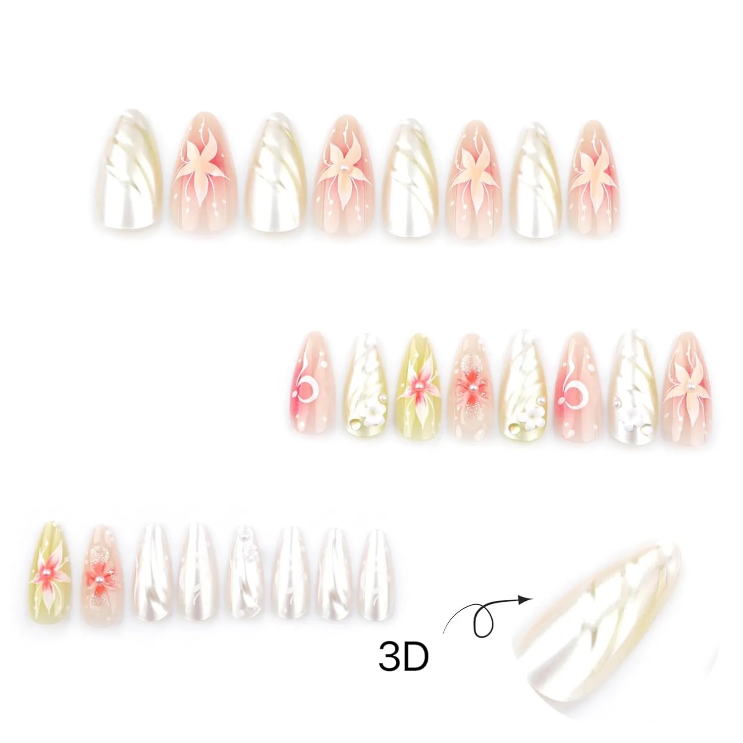 Ombre almond nails with a glossy 3D flower design. Medium full cover press-on set, 24 pcs for an instant salon look.